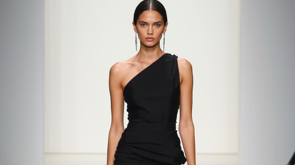 One-shoulder tops, asymmetric necklines, uneven hems—anything that breaks symmetry is trending. Also architectural folds, dramatic seam work, interesting cuts. These bring freshness to classic shapes.