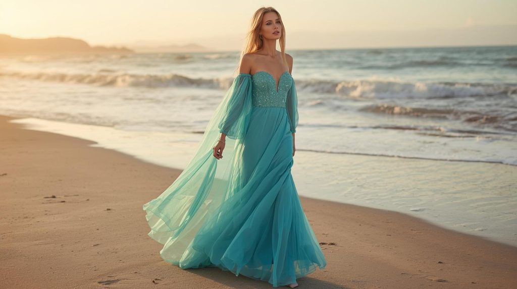 How to wear: Iridescent or metallic accessories, a mermaid-style dress or skirt, or prints that evoke shells and water.